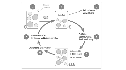 In seinem Buch “Alles eine Frage der Zeit” beschreibt der Autor, dass wir heute an vielen Stellen im Leben Zeit einsparen – schnelle Mails statt zeitaufwendige Briefe beispielsweise. “Doch anstatt diese gewonnene Zeit zu nutzen, stopfen wir sie wieder voll. Dadurch brauchen wir wieder Zeiteinspar-Möglichkeiten. So landen wir in einem Beschleunigungszirkel dem wir aber alle entfliehen wollen.”